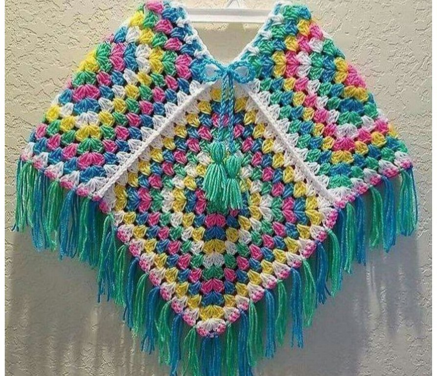 Renkli nakışlı, püsküllü kız örgü panço. Kayık yaka, askılı kol ve bol kesim bohem tarzda.Yaşa ve bedene göre fiyat sorabilirsiniz.