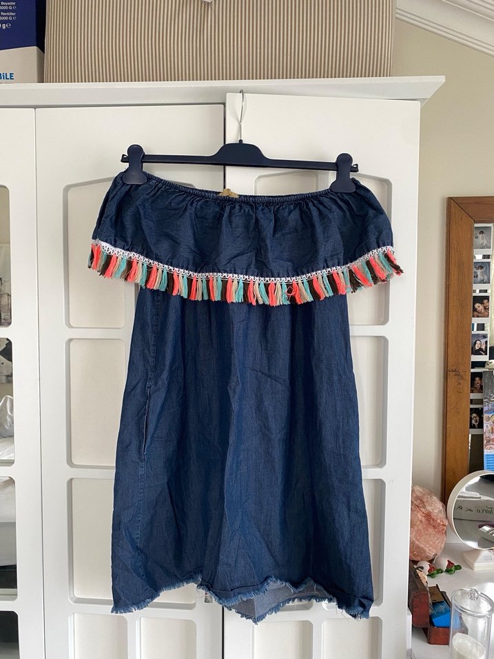 Mavi kot kumaştan, straplez yaka ve renkli püsküllerle süslenmiş. Nakış detaylı, bol kesim ve midi boyda bohem tarz elbise. S-M-L uyumlu