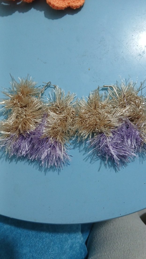 Kısa, renkli bohem tarzda, bej ve mor tonlarında yumuşak püsküllü mini küpeler. Parti için uygun.