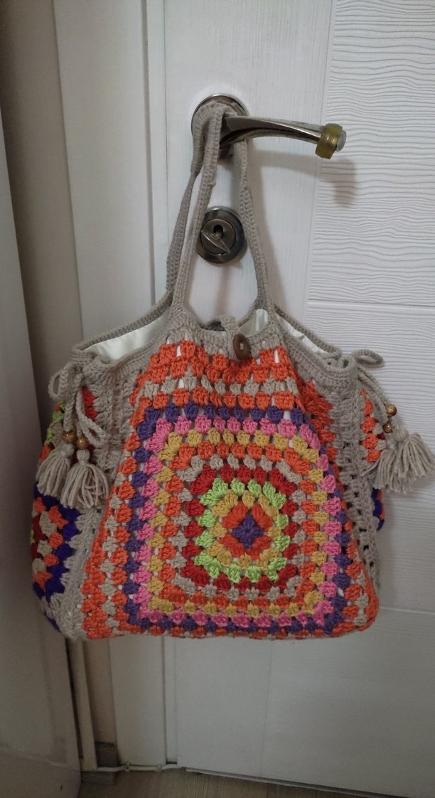 Gri tabanlı, renkli desenli örgü bohem kadın çantası, püsküllü detaylara sahip, günlük kullanıma uygun rahat bir tasarımdır. tamamen el işi