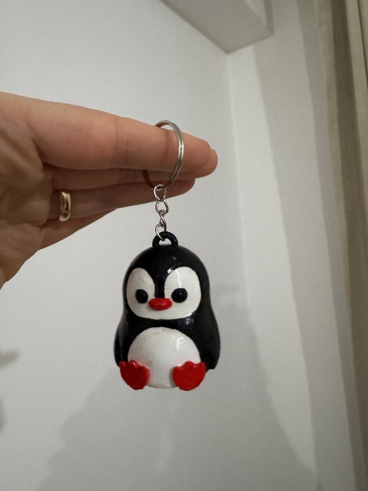Renkli püsküllü penguen anahtarlık, minimalist goth tarzıyla rock punk havası sunar. Siyah, beyaz ve kırmızı renkleriyle eğlenceli bir tasarıma sahiptir. Kendim boyadım ve vernikledim 3D printer ile basılmıştır