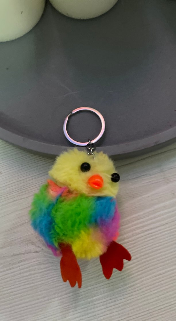 Renkli ve tüylü civciv figürlü, püskül detaylı anahtarlık, bohem ve retro tarzını yansıtıyor.