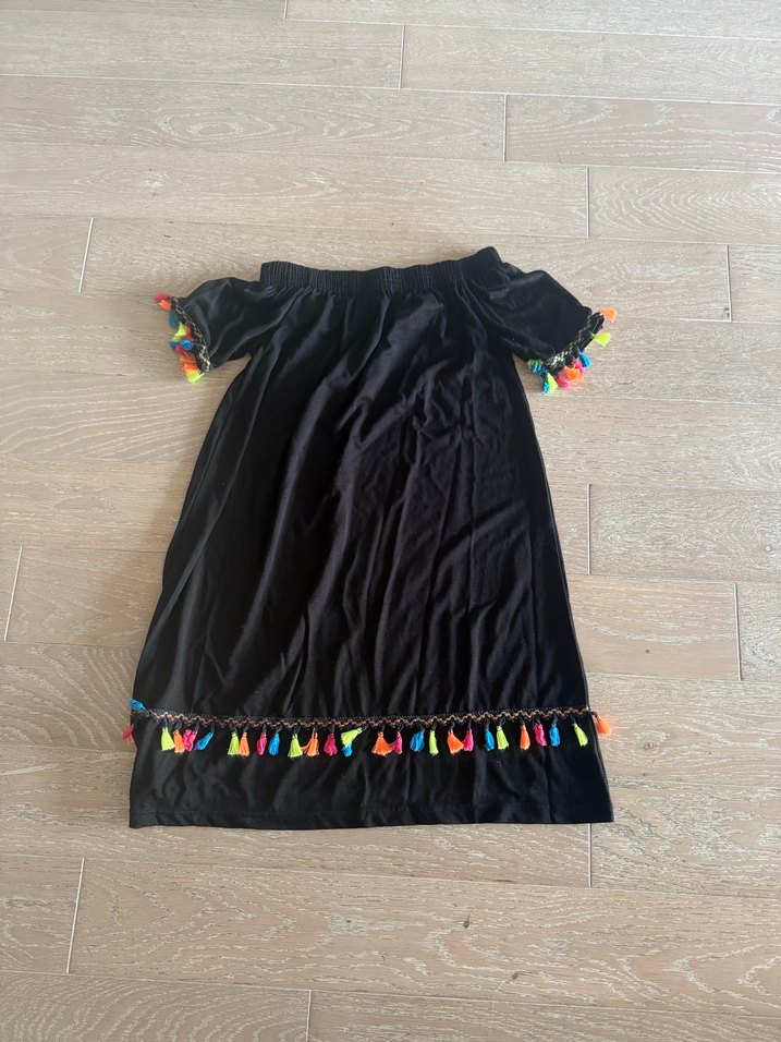 Renkli püsküllerle süslenmiş, kısa kollu ve bol kesim uzun siyah bohem elbise. Tekstil kumaştan, tekne yaka ve parti için uygun. Boy 70cm