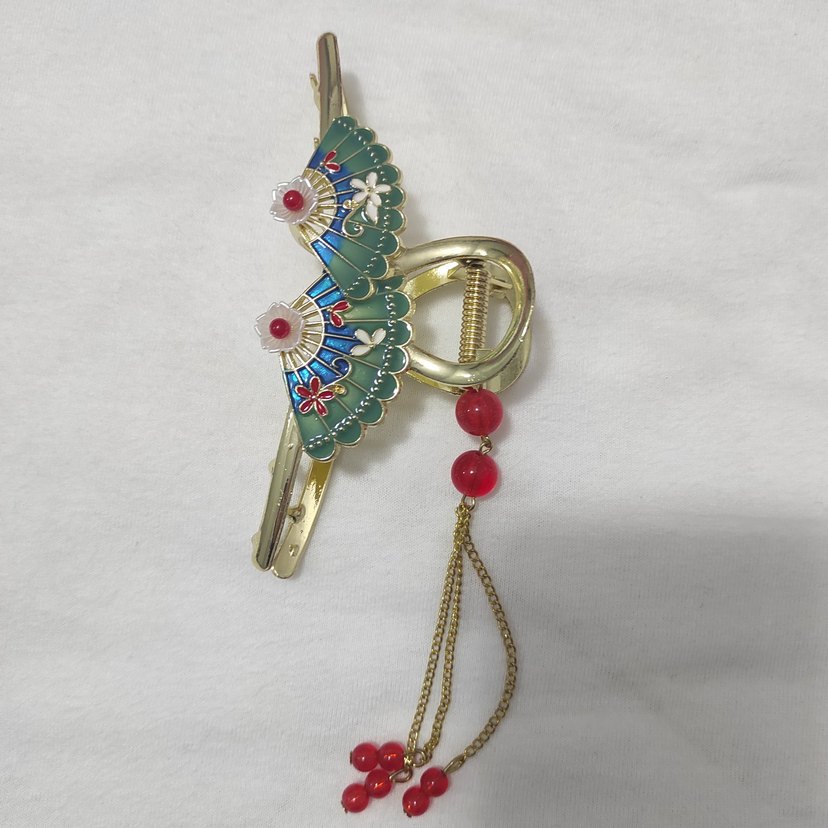 Renkli, ipeksi püsküllü ve dekoratif yelpaze detaylı vintage tarzda kadın saç tokası. Bohem ve retro görünümler için uygun.