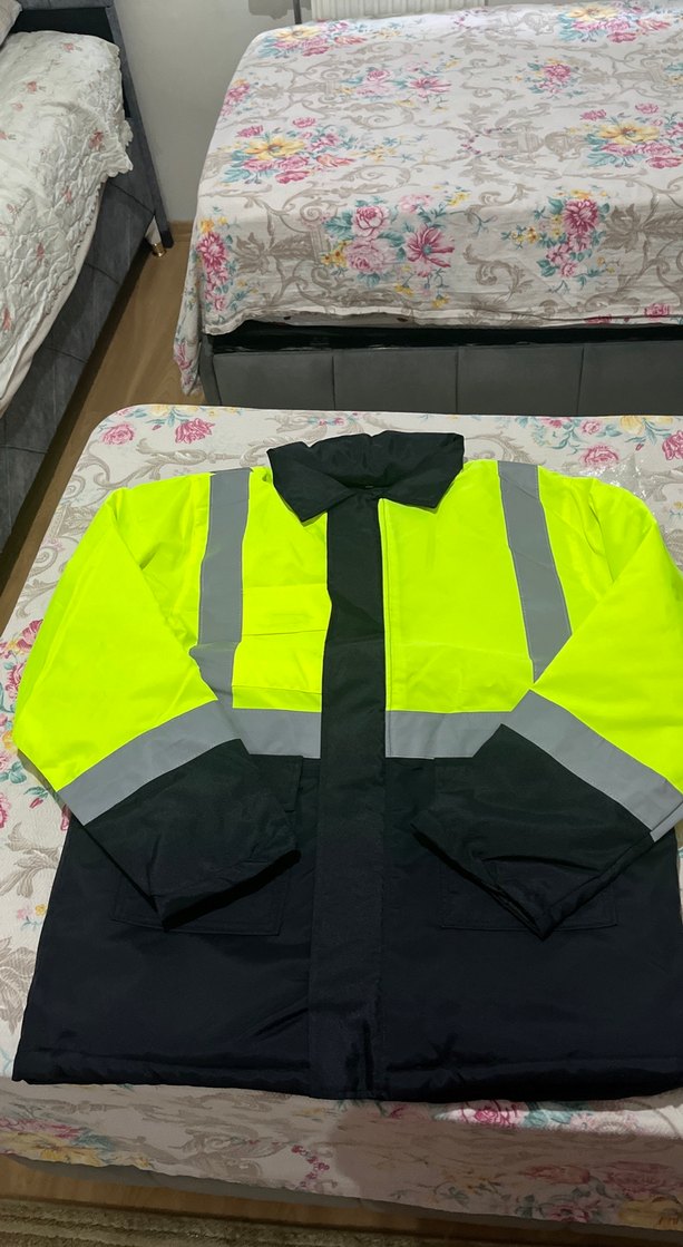Renkli ve reflektörlü şeritlere sahip, yakalı ve uzun kollu erkek yağmurluğu. Yumuşak ve sıcak kumaştan, cırt cırtlı kapamalı, sokak stili için uygun.