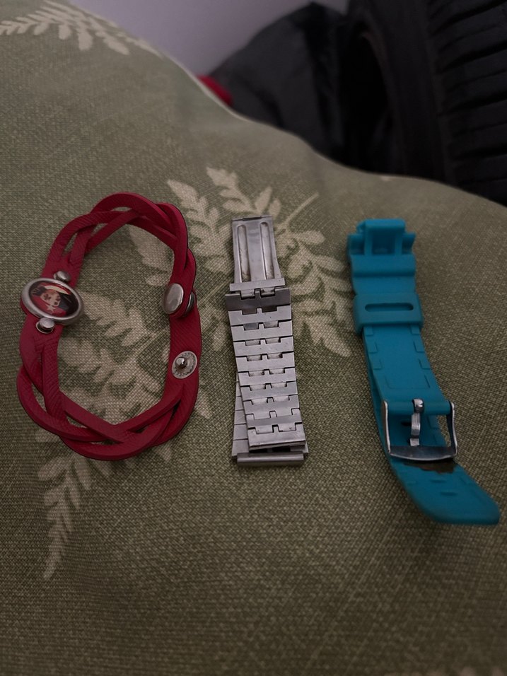 Kırmızı örgü deri, gümüş metal ve mavi silikon bileşenlerden oluşan renkli, vintage tarzda erkek saat kayışları. ⌚