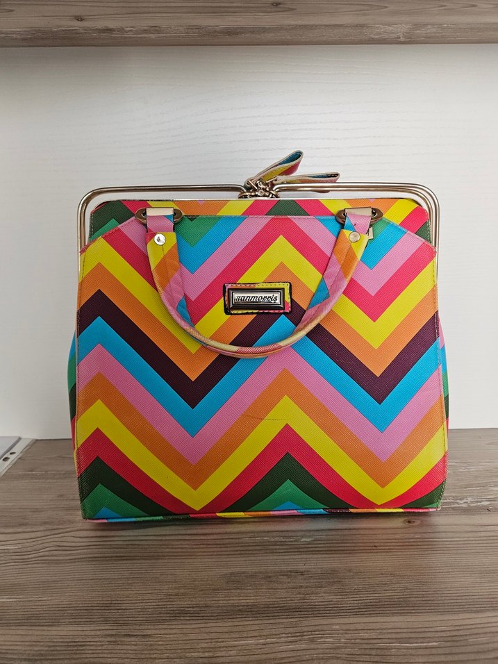 Renkli zigzag desenli, fermuarlı kadın çantası. Sentetik kumaştan üretilmiş, günlük kullanım için bohem ve retro pop kültür tarzında.