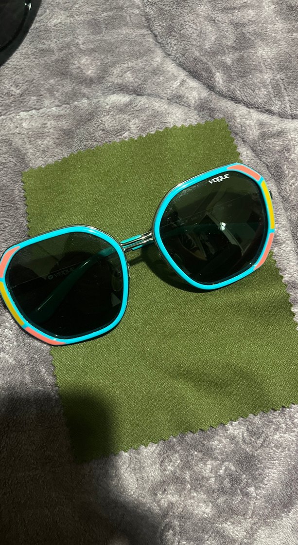 Vogue marka renkli, retro tarz kadın güneş gözlüğü, koyu lenslerle ve kullanışlı cırt cırtlı aksesuarla birlikte.