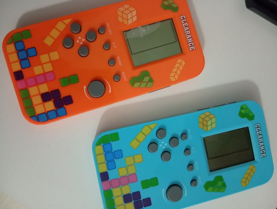 Renkli taşınabilir oyun konsolları, basit düğme kontrolleri ve ekranında piksel tarzı oyun grafikleriyle. Bir cihazda CLEARANCE etiketi bulunuyor.