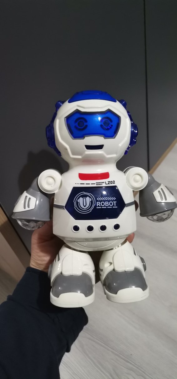 Renkli detaylara sahip beyaz robot figür, dijital yüz ve ışıklı kollara sahiptir. Üzerinde ROBOT LZ02 yazısı bulunur.