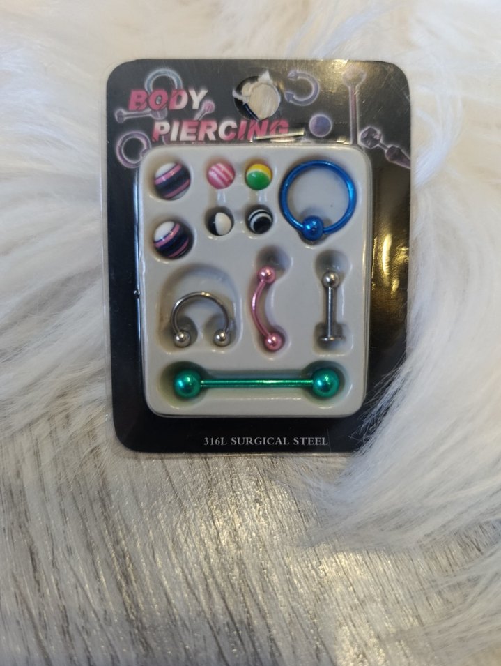 Renkli boncuklu ve kavisli tasarımlara sahip, cerrahi çelikten yapılmış rock punk ve grunge punk tarzına uygun vücut piercing seti.