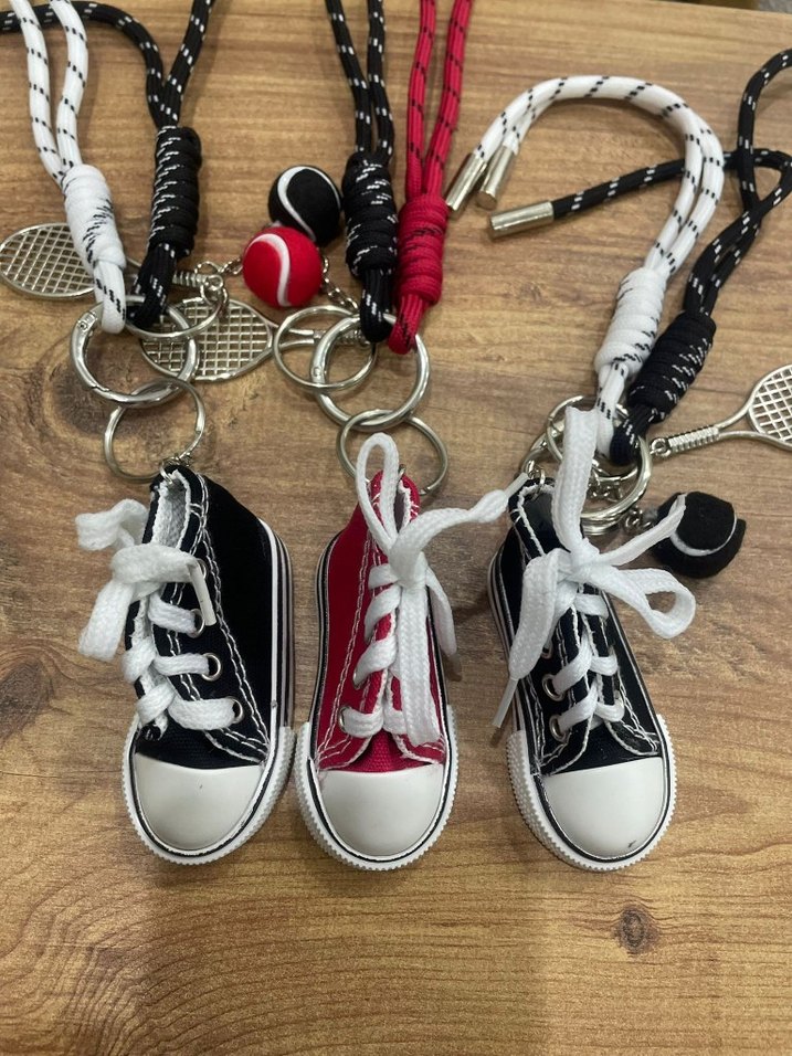 Renkli bağcıklar ve küçük tenis topu aksesuarlarıyla rock punk tarzı mini spor ayakkabı anahtarlıkları. ADET FiYATİ 197₺₺₺