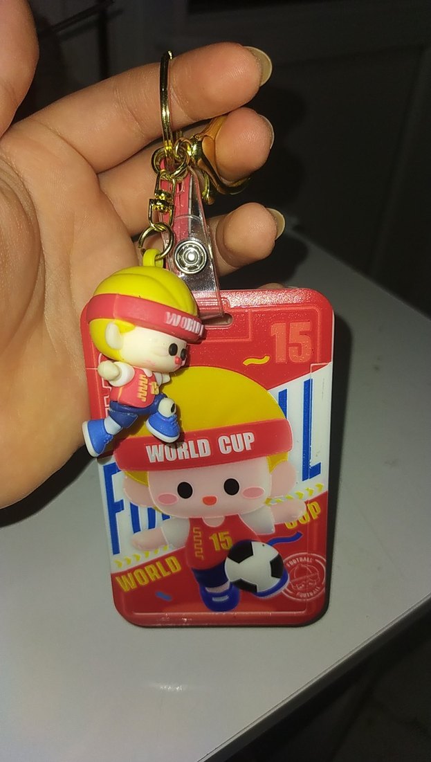 Renkli anahtarlık, altın tonlu klips Dünya Kupası temalı futbolcu figürüyle rock punk ve athleisure tarzını yansıtır. ⚽