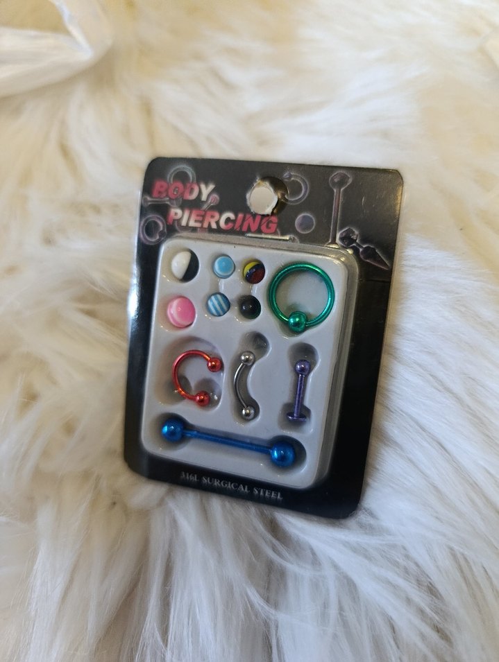 Cerrahi çelikten yapılmış, çeşitli şekil ve renklerde düğmeli canlı vücut delici seti. Rock punk ve grunge tarzlar için uygun.
