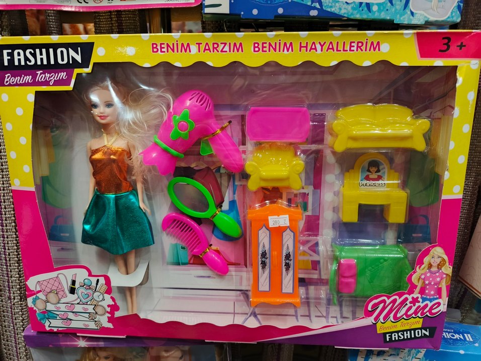 Renkli saç bakım aksesuarları ve minyatür mobilyalar içeren oyuncak seti, üzerinde "BENiM TARZIM BENiM HAYALLER" yazısı bulunur.