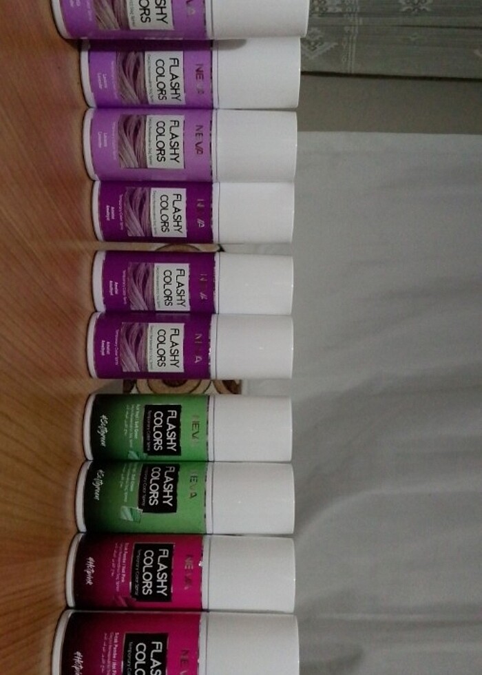 Renkli saç spreyleri yeşil mor lavanta pembe renkler var hiç kullanılmadı uygun fiyata veriyorumm. Saç boyası geçici. Tane fiyatı 15
