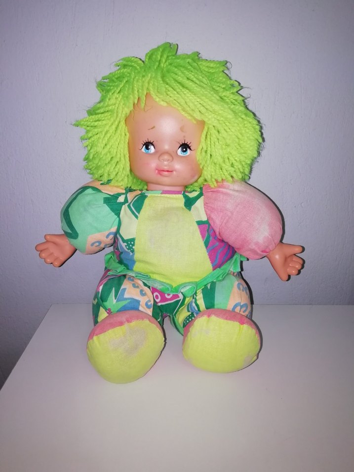 Parlak yeşil yün saçlı, çok renkli yumuşak kumaş kıyafetli oyuncak bebek. Plastik yüzü mavi gözlü ve nazik bir gülümsemeye sahip.