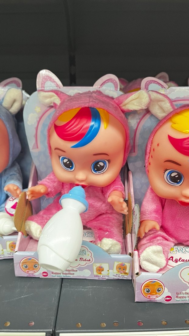 Canlı renkli saçlara sahip, yumuşak pembe kıyafetli ağlayan bebek. Su içip ağlama özelliği bulunur.