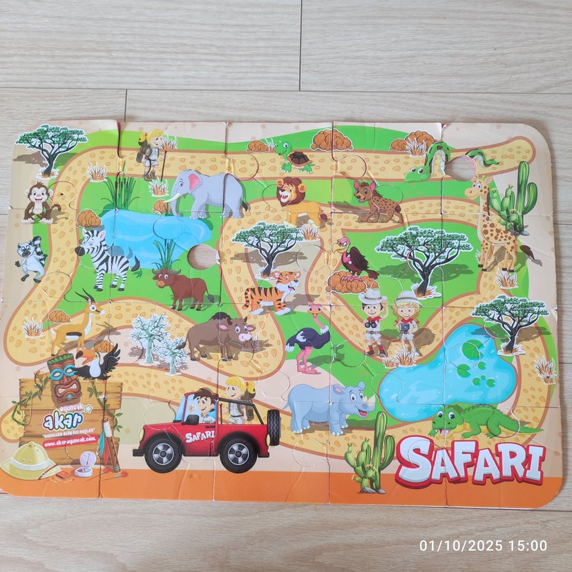 Baby& toys e-bebekten alınmıştır. 20 parçadan oluşmaktadır. Çeşitli vahşi hayvanlar ve safari jipli, renkli safari temalı çocuk yapbozu.