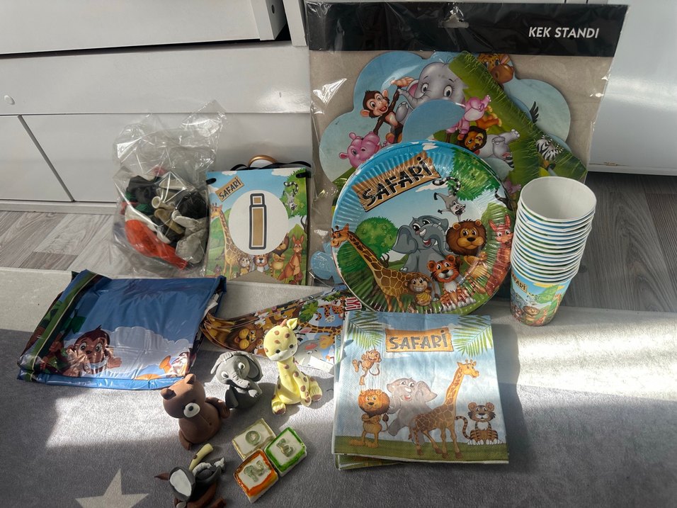 Safari temalı masa örtüsü iyiki doğdun duvar ve masa yazısı üç katlı kek standı 16’lı bardak,peçete,tabak balonlar ve zinciri pasta üzeri için şeker hamurundan yapılmış figürler parçaları biraz koptu anlıyorsanız eğer yapıştırabilirsiniz balonlar pompayla şişirildi ağız değmedi balonlar biraz kirlendiler onlarda şişerse görünmezler