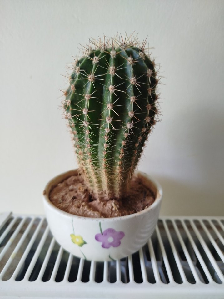 Çiçek desenli renkli seramik saksıda yeşil kaktüs, ev dekorasyonuna doğal bir dokunuş katıyor .