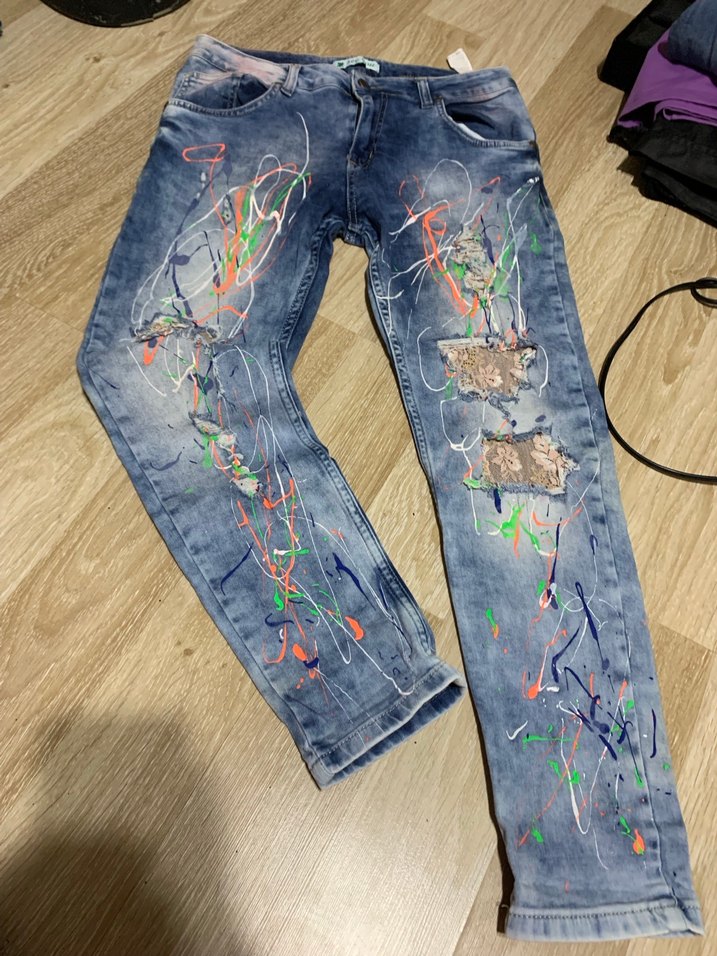 Bu salaş kesim kadın kot pantolon, renkli batik desen ve taşlı detaylara sahiptir. Uzun boy ve sokak stili ile günlük kullanıma uygundur. Bol likralıdır 38-40-42 bedene uygun