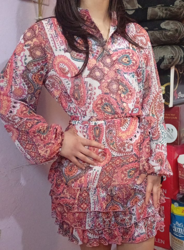 Renkli bohem tarzda, uzun kollu, yüksek yakalı, fırfırlı mini elbise, yumuşak sentetik kumaştan günlük kullanım için.