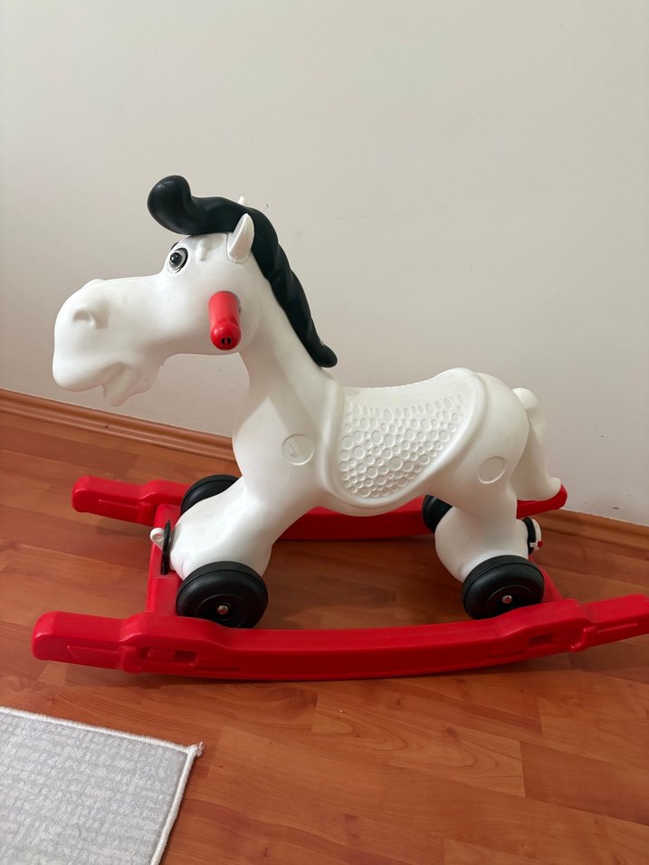 Beyaz gövde, siyah yele ve kırmızı sallanan taban ve tutacaklara sahip renkli sallanan at oyuncağıdır. Çocuklar için sallanarak eğlencelidir.