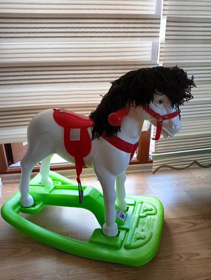Beyaz gövdesi, kırmızı eyer ve koşum takımı ile renkli sallanan at oyuncak. Siyah yeleli ve yeşil sallanma tabanına sahip.