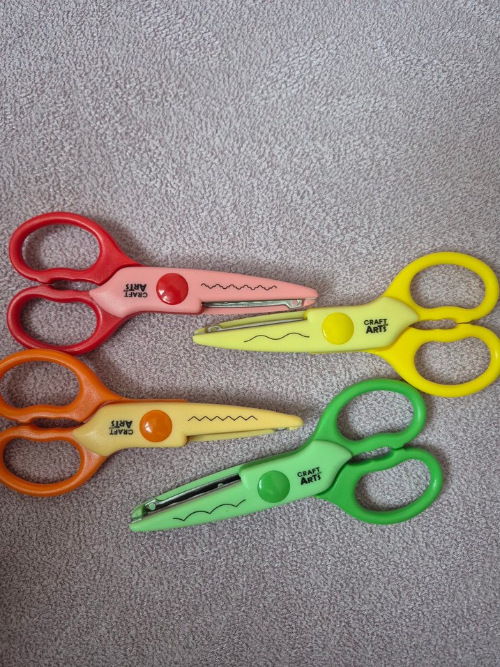 Farklı desenli bıçaklara ve canlı renkli saplara sahip sanat makasları seti, yaratıcı okul etkinlikleri için uygundur. ✂️ adet ve desen belirtiniz.