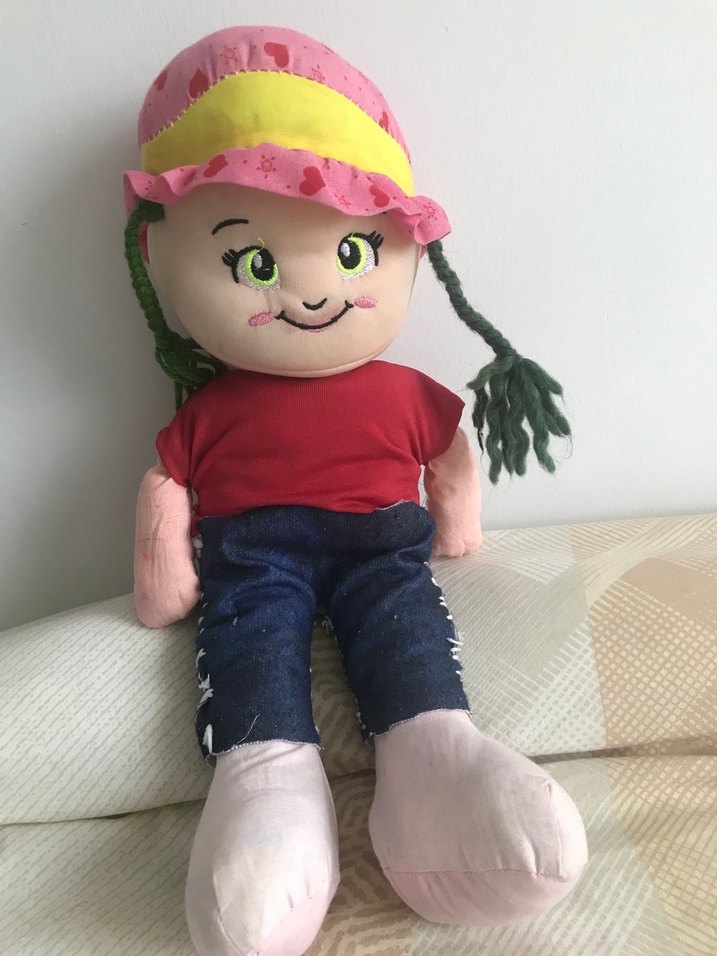 Pembe ve sarı şapkalı, kırmızı tişörtlü ve mavi pantolonlu renkli peluş bebek. Yeşil örgülü saçları ve gülen yüzü var.