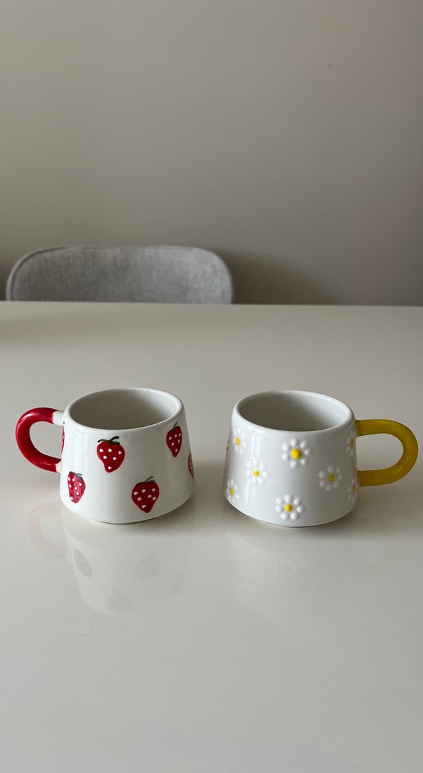 Çilek ve papatya desenli, kırmızı ve sarı saplı beyaz seramik iki kupa seti, neşeli içecekler için ideal ☕. Birkaç kere kullandım sarı papatyalı olanın sapı kırılmıştı ben de japon yapıştırıcısıyla yapıştırdım hiçbir sıkıntısı yoktur İkili fiyattır