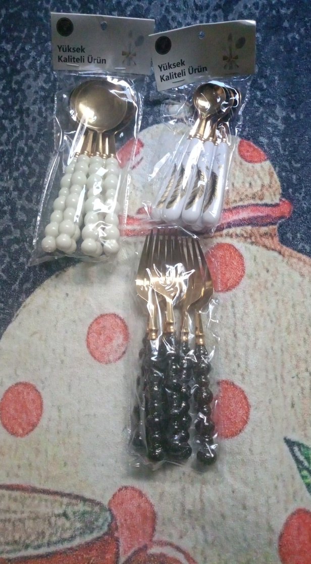 Koyu, beyaz ve krem renklerinde dokulu saplı çatal ve kaşık seti. Her set ayrı ayrı paketlenmiştir.