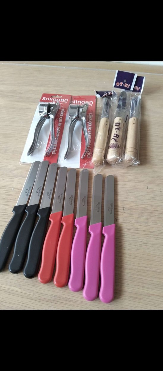 Renkli saplı çoklu bıçaklar, iki metal sarımsak ezici ve ahşap saplı mutfak gereçleri seti. Bıçaklar 'Solingen' markalıdır.