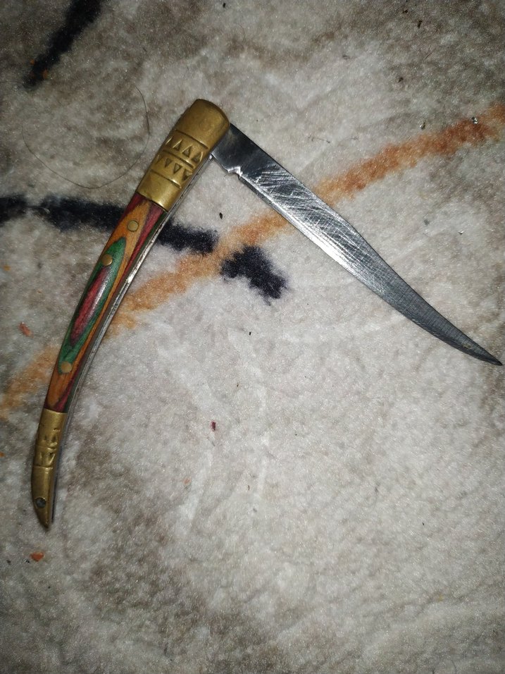 Kıvrık metal bıçağa sahip, renkli sapı ve dekoratif pirinç detayları olan katlanır bıçak.