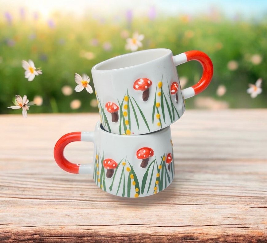 Renkli saplı beyaz kupalar, mantar ve çim desenleriyle neşeli bir görünüm sunar. Seramik ürün 2 adet fiyat