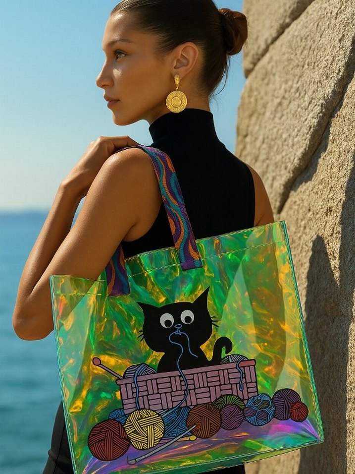Şeffaf yüzeye sahip, renkli saplı ve ipliklerle oynayan kedi desenli kol çantası. Parlak, ışık yansıtan dokusu bulunur. Pembe Pijama by Esra Sönmezer Markasıdır RENK DEĞİŞTİREN HOLOGRAM Çanta Işıltının en sofistike hali 10 kg taşıma gücü Geceden gündüze her kombine uyum IŞIK NEREDEYSE SEN ORADASIN! Gümüş hologram çanta ile tüm bakışlar üzerinizde. Şıklığın dayanıklılıkla buluştuğu noktadasınız. Her adımda ışık saç! Gümüş hologram çanta 10 kg’a kadar taşıyor, sana sadece parlamak kalıyor ✨