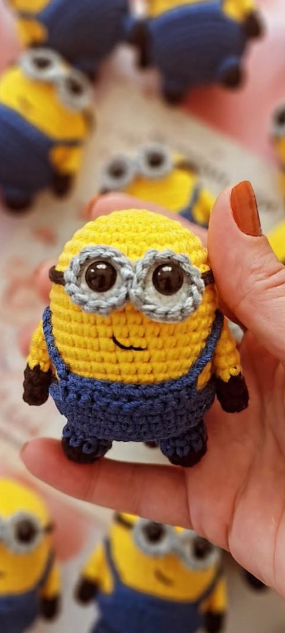Detaylı örme gözlük ve kıyafetlere sahip renkli sarı amigurumi minyon peluş oyuncak.