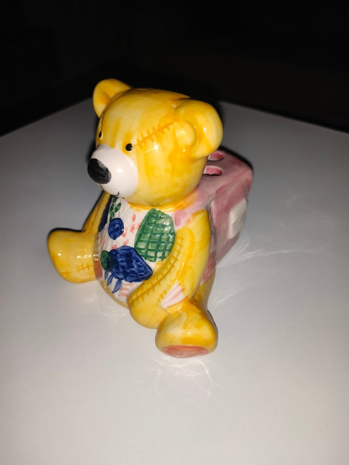Parlak yüzeyli, detaylı yama desenli renkli sarı ayıcık biblo diş fırçalık, mekanlara şirinlik katıyor.