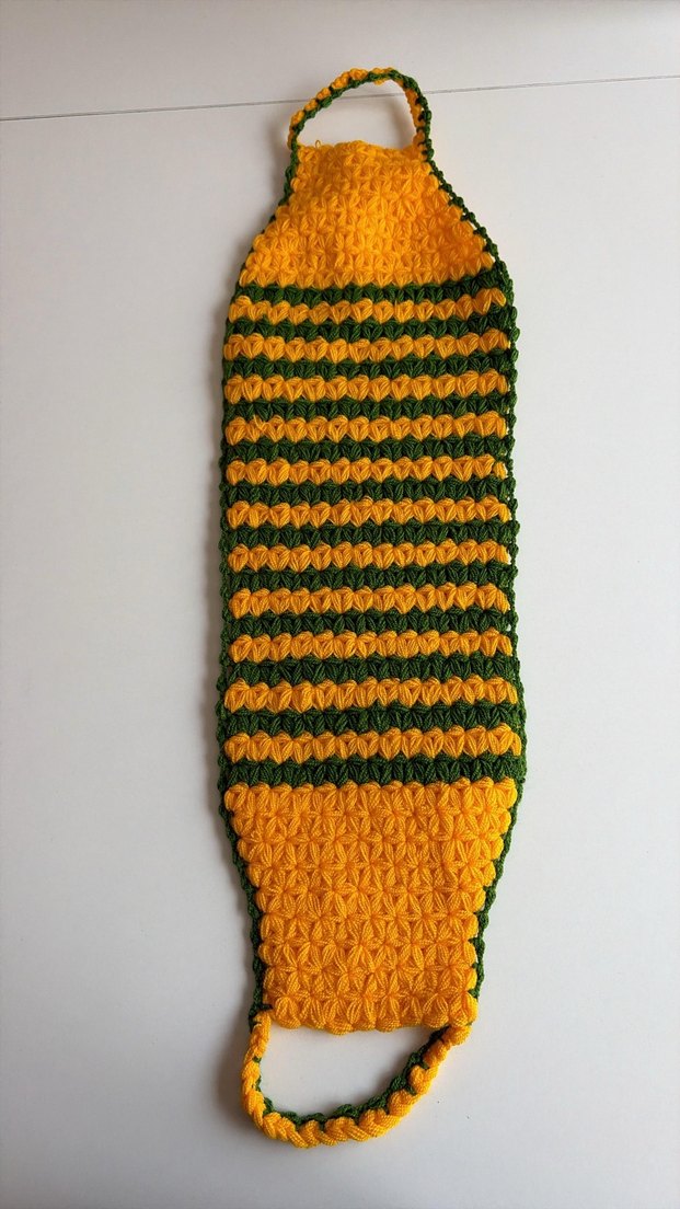 Bu renkli sarı banyo süngeri, yeşil çizgilerle dokulu bir desene sahip olup rahat ve etkili temizlik sağlar. banyo lifi. El örmesidir en kaliteli ipliklerle örülmüştür.