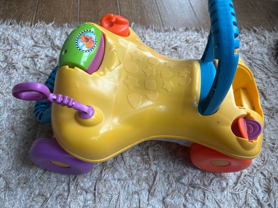 Renkli sarı bebek yürüteci, dengeyi destekleyen interaktif düğmeler ve şekiller içerir. Bebeklerin hareket kabiliyetini geliştirir.