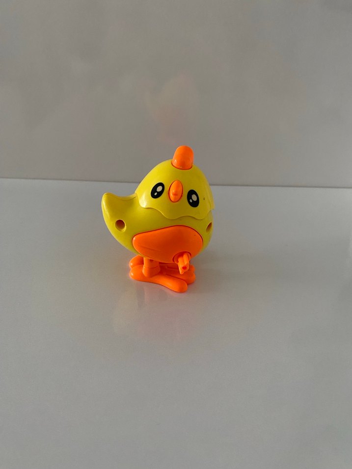 Turuncu detaylara sahip renkli sarı civciv oyuncak, çocuklar için uygun sevimli yüz ve küçük bacaklarla tasarlanmıştır.