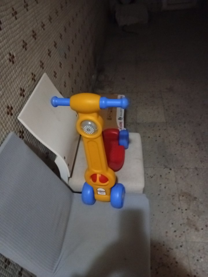 Bu renkli çocuk scooter'ı, mavi tutacaklar ve tekerleklerle sarı gövdeye sahiptir, küçük çocuklar için uygundur.