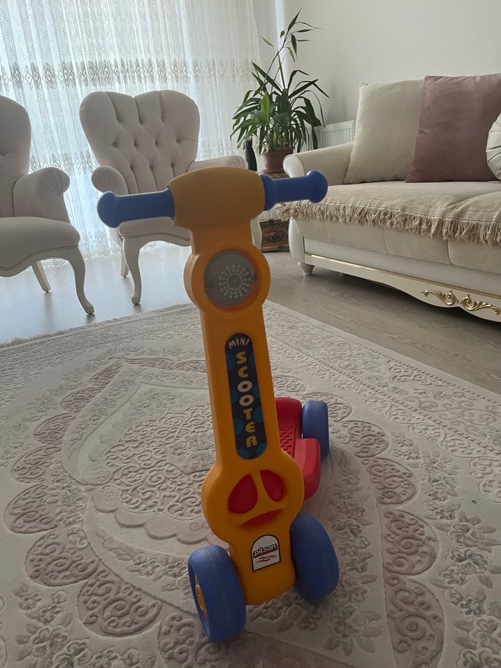 Renkli sarı çocuk scooterı, denge ve kolay kullanım için üç tekerlekli sağlam tasarıma sahiptir.