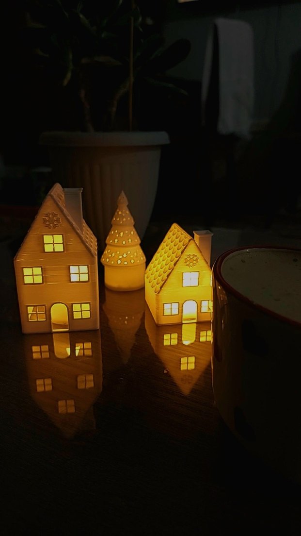 Renkli sarı ev ve yılbaşı ağacı şeklinde mumluk seti, sıcak ve huzurlu bir ışık sunar. ️