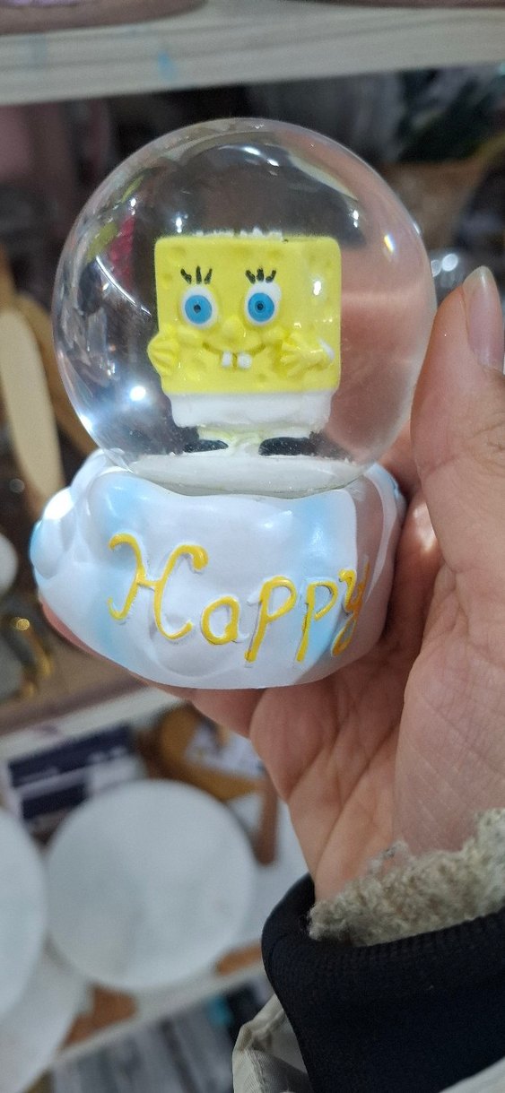 Renkli sarı figürün yer aldığı ve tabanında "Happy" yazan kar küresi. Neşeli bir dekoratif üründür. ❄️