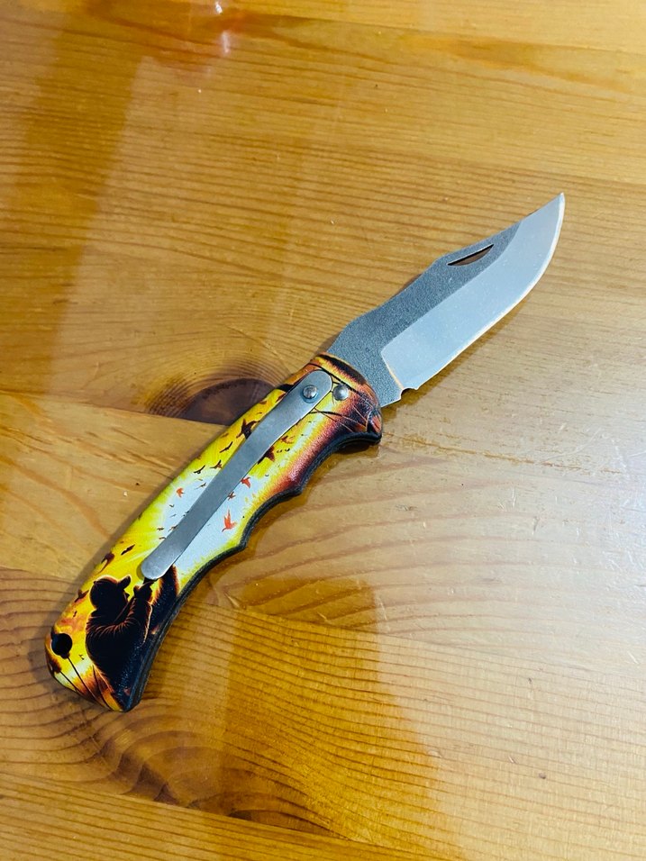 Canlı desenli sarı saplı katlanır cep bıçağı, paslanmaz çelik keskin bıçakla donatılmıştır. ️çakı