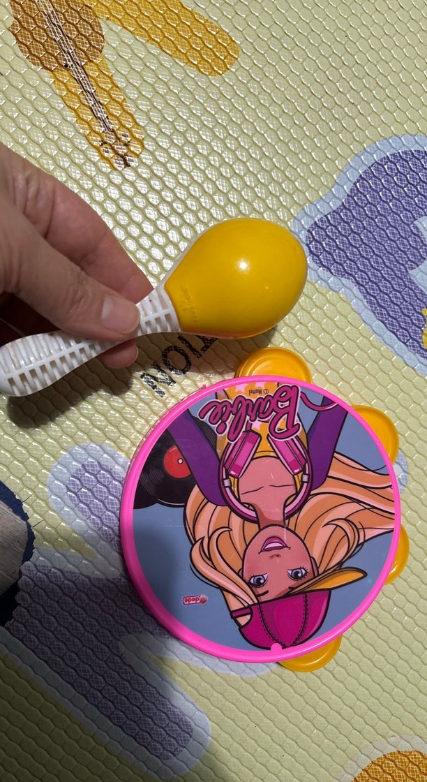Renkli sarı marakas ve pembe, çizgi film desenli tef çocukların oynayabileceği müzik aletleridir.