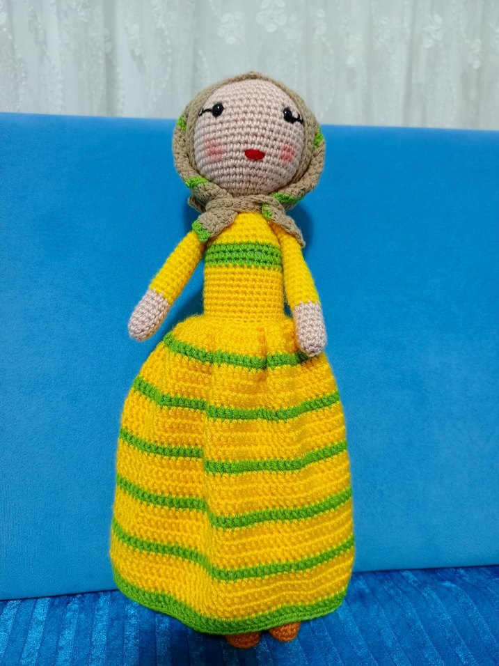 Başörtülü, yüzü detaylı işlenmiş, çizgili sarı renkli örgü bebek.