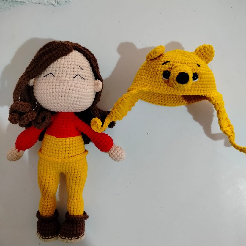 Renkli sarı ve kırmızı kıyafetli örgü bebek ve kulaklıklı sarı ayıcık şapka. Yumuşak ve el yapımı tasarım. [23 cm TAMAMI EL YAPIMI.] Amigurumi bebek. Winnie the Pooh.
